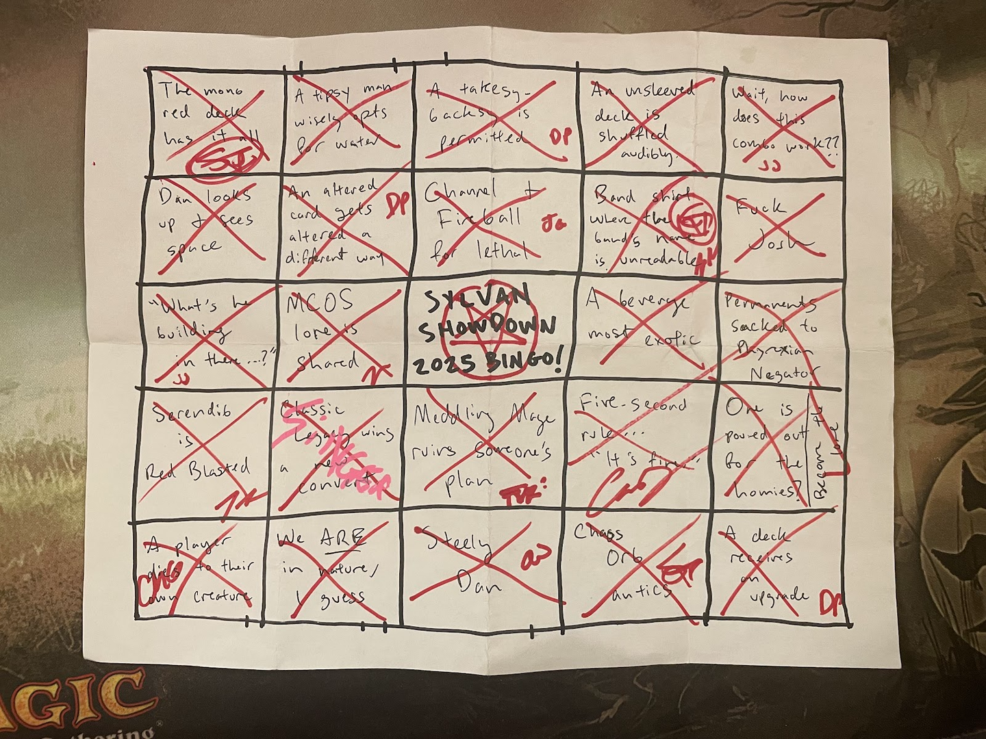 A lowlight was getting two Ernies Control Magic’d by Cayce after I neglected to board in Red Blast, but this grim fate was perhaps foretold when I gave the bingo card the square “a player dies to their own creature.”