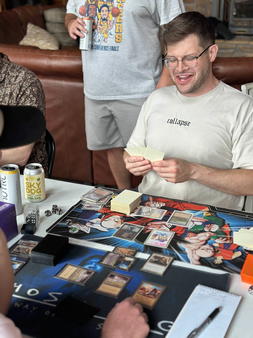 Then time passes, and the next minute you’re at a giant cabin full of sweet weirdos in the woods of Tennessee. It’s summer, and you’re sitting in the shade outside. Water trickles down the rocks and the bugs are loud. Beverages and lore have been flowing freely, and you’ve somehow just assembled the Channel+Fireball combo two games in a row to thus win a bounty for a dope artist-signed playmat. There are four rounds left to play before the cookout, but in your heart you have already won what you came to win…