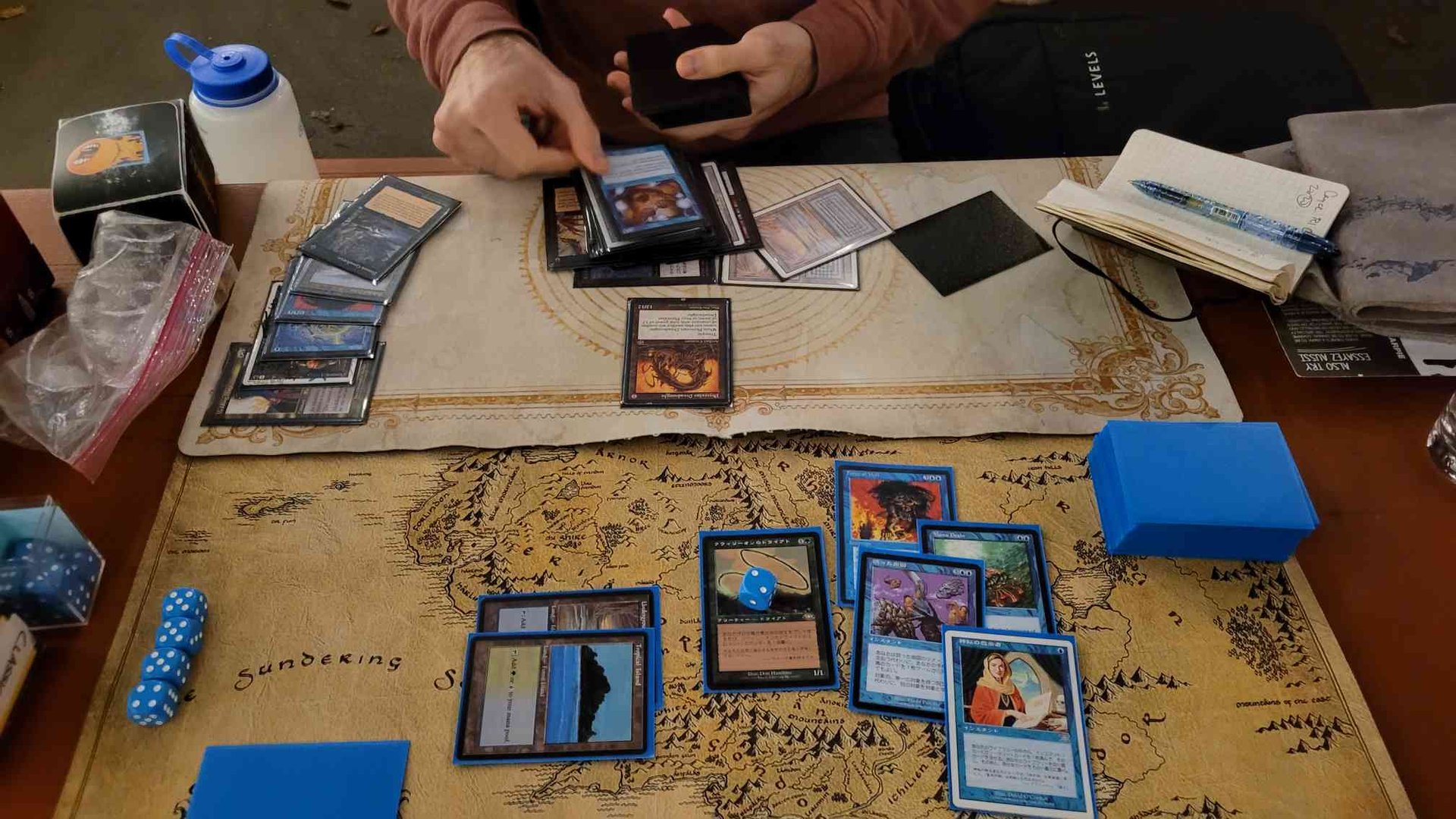 As always, we had a pile of prizes for everyone to group sign, including white border foils courtesy of Bob. The damp night and fan exhaust from a nearby HVAC unit formed weird microclimates that increased the humidity in some areas of the patio. Bob's cards were sweating harder than a GP grinder on Day 2, and the prize foils were curling (as expected). But we all took it in stride because the games were high variance, which was typical of Type 1.